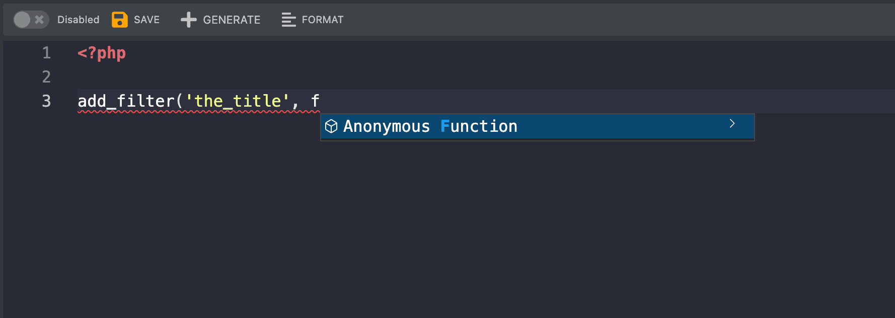 When adding filters and functions, you can automatically generate an anonymous function with the correct parameters and return types